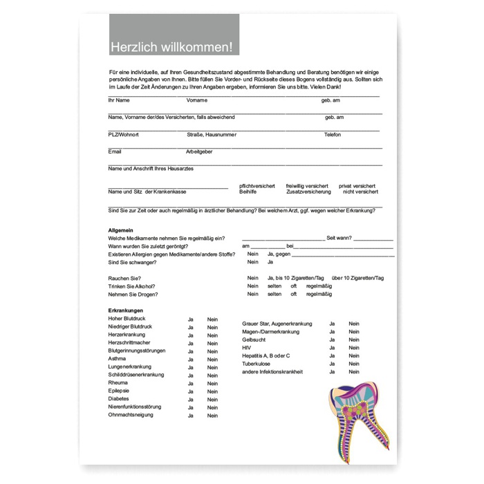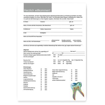 Aufnahmebögen zum Gesundheitszustand von (Neu)patienten/innen. Hochwertiges festes Papier, gut beschreibbar mit jedem Schreibgerät.