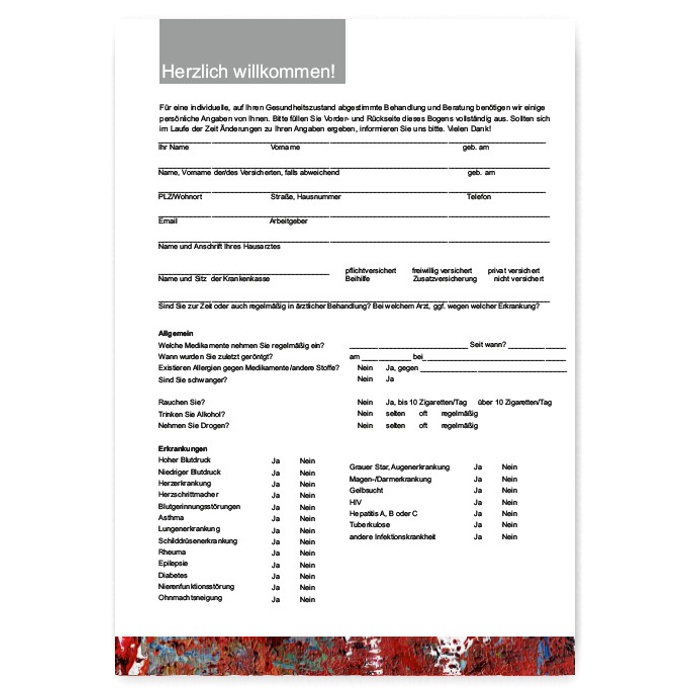 Aufnahmebögen zum Gesundheitszustand von (Neu)patienten/innen. Hochwertiges festes Papier, gut beschreibbar mit jedem Schreibgerät.