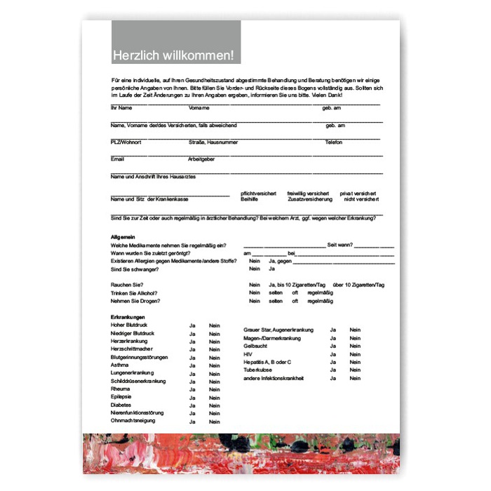 Aufnahmebögen zum Gesundheitszustand von (Neu)patienten/innen. Hochwertiges festes Papier, gut beschreibbar mit jedem Schreibgerät.