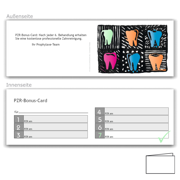 mit 5/1 Feldern für 6 Behandlungstermine + 1 kostenlose PZR sowie mit persönlichem Namensfeld des Patienten/der Patientin.