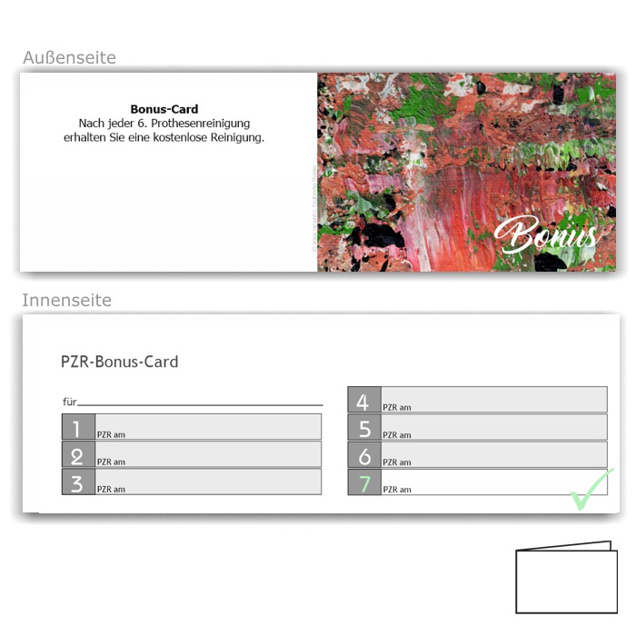 Klappbarer Bonuspass in Visitenkartengröße mit 6/1 Feldern für Behandlungstermine/ eine kostenlose Prothesenreinigung und persönlichem Namensfeld des Patienten/der Patientin im Innenbereich. Außen befindet sich das Bildmotiv und Platz für den Praxisstempel.
