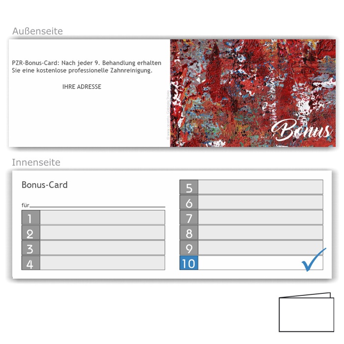 Klappbare Bonuspässe in Visitenkartengröße, innen mit 9/1 Feldern für 9 Behandlungstermine + 1 kostenlose PZR sowie mit persönlichem Namensfeld des Patienten/der Patientin.