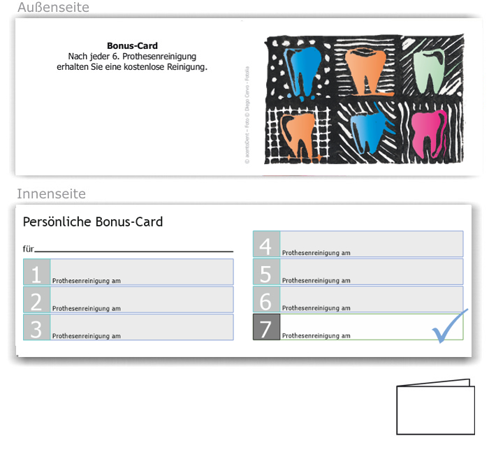 Klappbarer Bonuspass in Visitenkartengröße mit 6/1 Feldern für Behandlungstermine/eine kostenlose Prothesenreinigung und persönlichem Namensfeld des Patienten/der Patientin im Innenbereich. Außen befindet sich das Bildmotiv und Platz für den Praxisstempel.