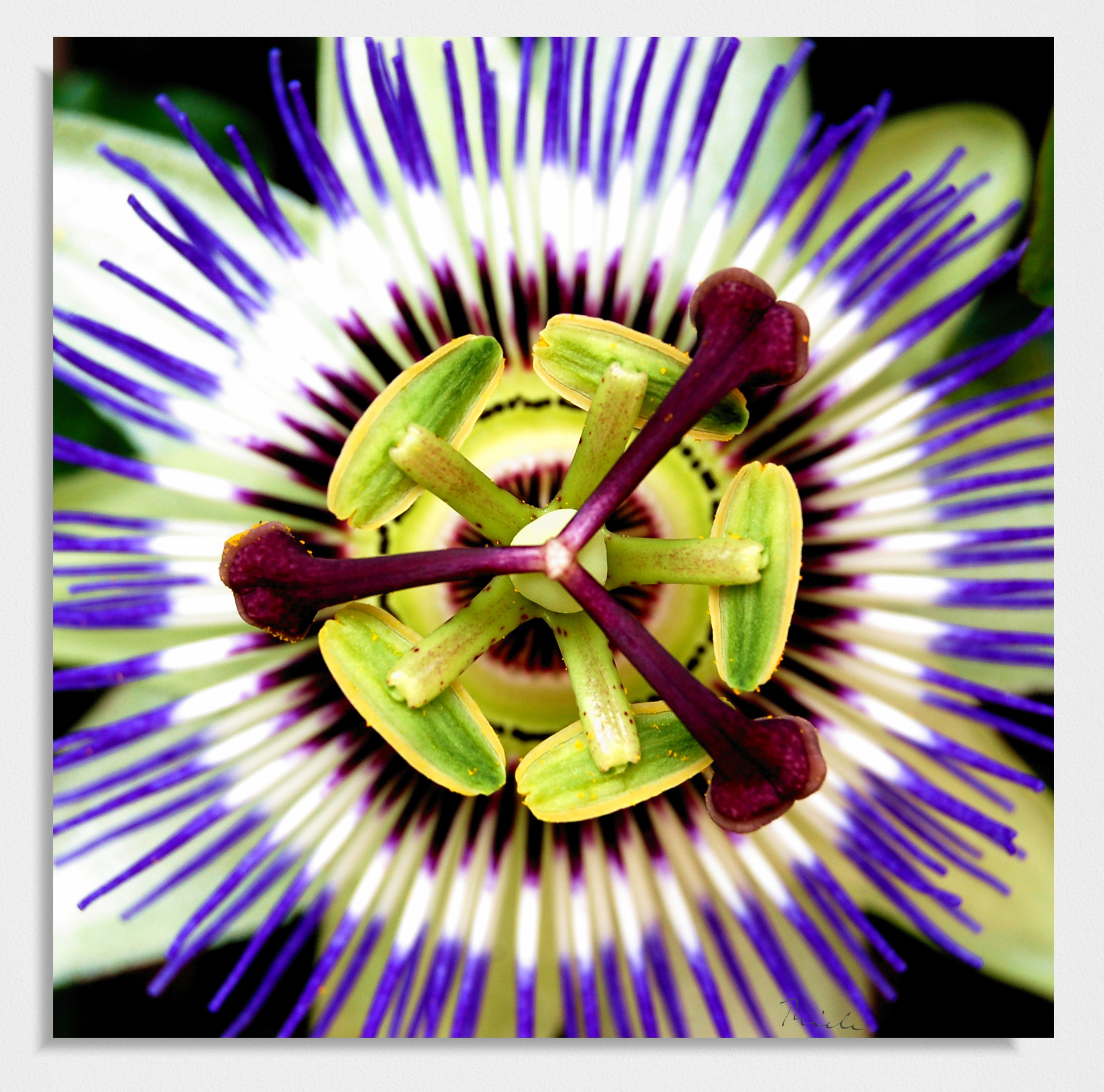 Zauberhafte Draufsicht auf eine Blüte der Passionsblume